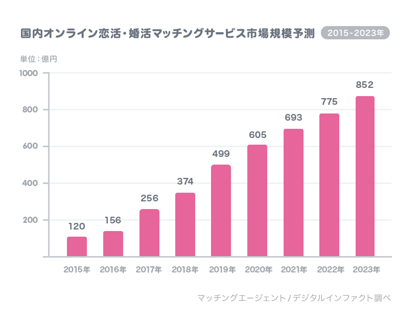 オンライン恋活・婚活マッチングサービス市場は2018年に374億円。大手事業者が提供するサービスを筆頭に高い水準で成長し、2023年には約2.3倍の852億円に拡大する見通しだ。サイバーエージェント連結子会社でマッチングサービス「タップル誕生」を運営するマッチングエージェントの調査によるため、業界筋の分析とあっては、ポジショントークの観点から、このような楽観的な予測はやや割り引いて考える必要はある。