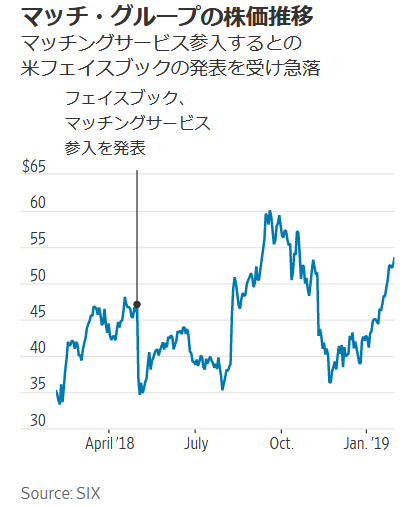 海外では、フェイスブックに加えて、マッチ・グループの台頭が著しい。「ティンダー」などを傘下に持つマッチ・グループの株価は、フェイスブックが独自サービスの展開により株価も脅かされる場面があった。しかし、マッチ・グループの売上高の約95%は広告ではなく会費が占めており、フェイスブックは広告収入に依存しているばかりかユーザーのデータ流出の問題を引き起こしたこともあり、マッチ・グループの地位は揺るがなかったようだ。