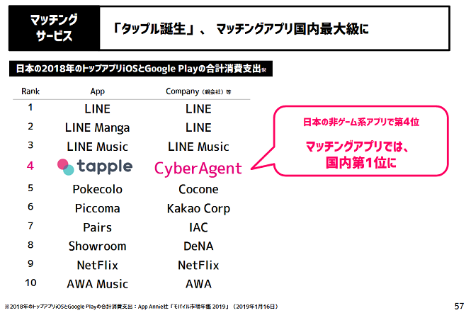 日本における業界最大手は、サイバーエージェント(4751)が提供する「タップル誕生」。マッチングアプリとして消費支出金額ベースで国内最大であり、非ゲームアプリのなかでも4位となっている。