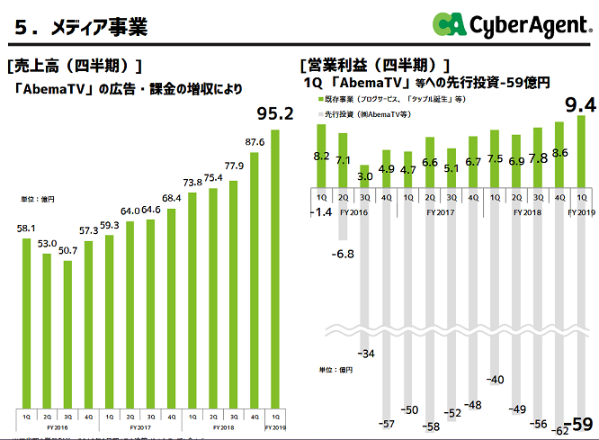 「タップル誕生」は、サイバーエージェントの収益柱として、インターネット広告、ゲーム事業に次ぐ規模だ。しかし、AbemaTVへの先行投資が膨らんで、全社の利益が伸び悩む局面を迎えている。19/9期の業績見通しは、第1四半期時点でいきなりの下方修正と、失望を呼んだ。コストや投資のコントロールの変化や収益の回復を見極める局面か。