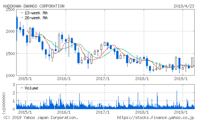 KADOKAWAはご承知のとおり、出版およびアニメ・実写製作大手の角川と動画配信のドワンゴ(ニコニコ動画)などで構成される複合企業体だ。本来は我が国のコンテンツビジネスを牽引すべき企業なのだが、2014年の経営統合以来、業績は振るわない。