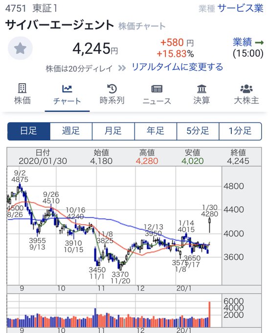 とはいえ、門出の祝いとしてサイバーエージェントの株価の急伸は悪いことではない。なにしろ、この日29日の日経平均株価は1.7%安だったのだから。サムスンの堅調な見通しや米ラムリサーチの楽観的な半導体製造装置市場の見通しをあざ笑うかのようにザラ場は総じて振るわない展開。新型肺炎の消費や生産動向への影響度に対する警戒感が高まり、春節休場明けの中国はハンセン数・香港市場が約2.7%、さらには台湾5.75%の大幅下落に引きずられる展開だった。