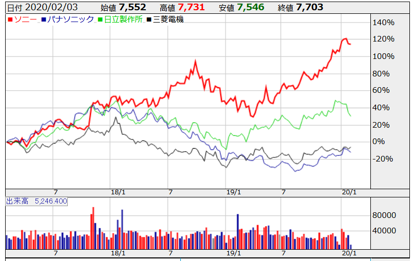 さて、ここまで意図して日本を代表するエレクトロニクス(and IT)企業についても言及してきた。その理由は、厳しい外部環境であっても順当に利益を伸ばしている企業はしっかり株式市場から評価されており、もちろん復活についても同様だ。下のチャートはNECと富士通の3年相対株価チャートだ。意外に思われるかもしれないが、米中貿易摩擦に伴う世界経済の減速感にも関わらず、大筋右肩上がりとなっている。日本のだめなオワコン企業と見做している人も多いだろうが、リストラの一巡に加え、国内ITの堅調さに支えられて、急速に収益性が改善している。遥かに規模の小さいNOAHも経営の舵取り次第では蘇る余地はある。