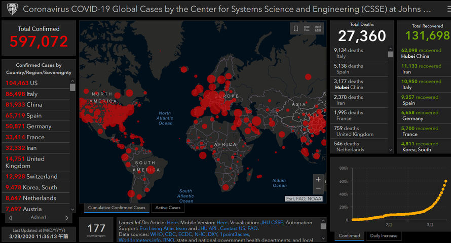 わかりやすいのは、ジョンズ・ホプキンス大学のダッシュボード(クリックすると大きくなります)です。感染者数・死者数に関して、たとえば日本は客観的に見て抑え込んでいるほうだと言えるでしょう。一方でイタリア、スペイン、アメリカはまさに感染者数・死者数の伸びのピークを迎えつつある状況です。数値の大きさだけでなく、前日比の伸び率でも考えて見るのも、冷静さを取り戻すには良いかもしれません。
